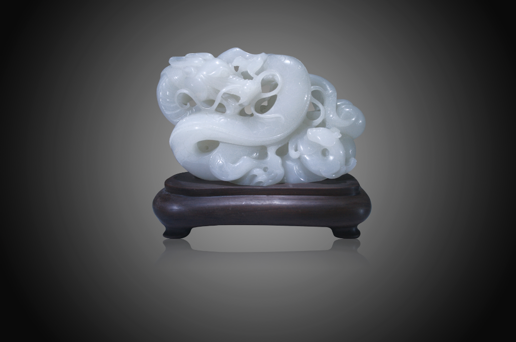 傳說龍能隱能顯,春風時登天,秋風時沉淵。又能興云致雨和騰云駕霧。龍后成為皇權、貴族、富貴象征。整幅作品,采用立雕形式構思設計,運用鏤雕、圓雕等多種技法,雕工細膩,紋理可見。質地晶瑩潤澤,打磨細致。一氣呵成,雕工師法自然,是一件以龍為主題的玉雕精品之作。