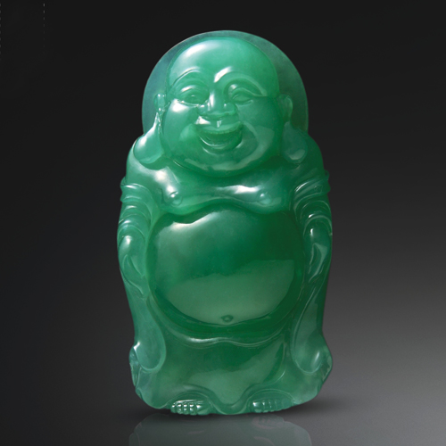笑臉立佛,滿綠冰潤,腹部渾圓飽滿,熒光內(nèi)蘊(yùn)。