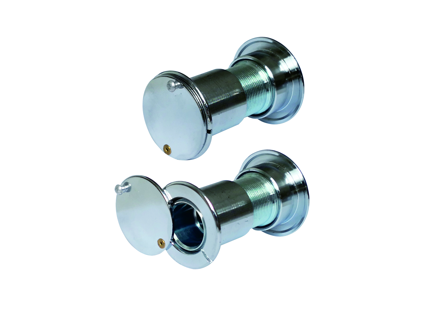 防火門鏡是通過裝在門鏡芯套內的高膨脹材料在火 災溫度(≥180℃)下迅速膨脹發泡,在極短的時間內 ( 一般≤8 min), 將防火門窺視孔封堵, 起到阻止火 勢蔓延、煙氣、毒氣外溢的作用。本產品設計新穎、結構合理、光學鏡片組,視角廣闊、造型美觀大方。門鏡 所用金屬配件鍍鉻,具有防腐蝕、防氧化、性能穩定、 使用壽命長、安裝簡便等。
